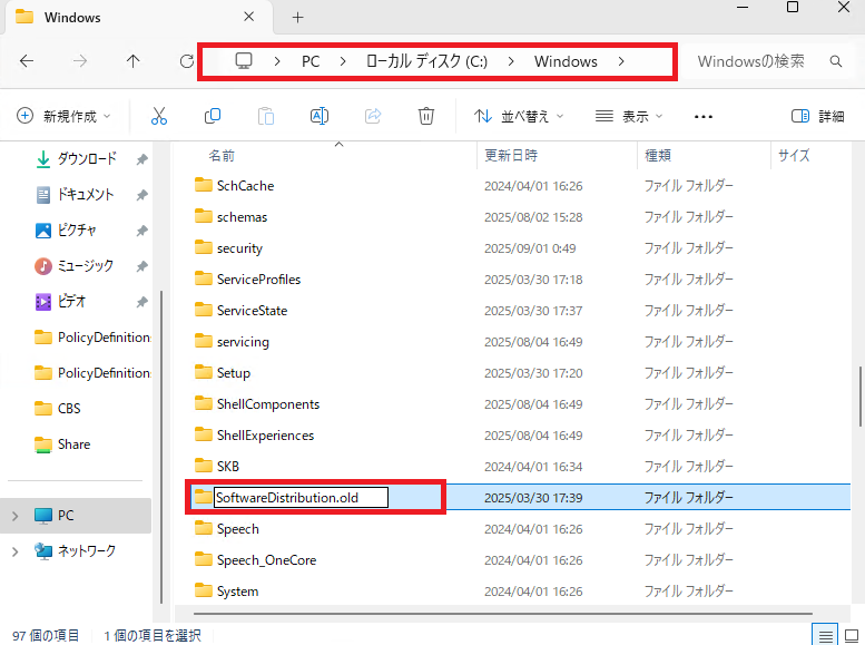 3.”C:\Windows\SoftwareDistribution” から “SoftwareDistribution” フォルダーを “”SoftwareDistribution.old” などに名前変更します。
