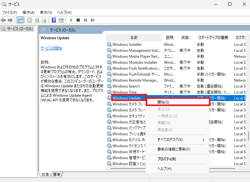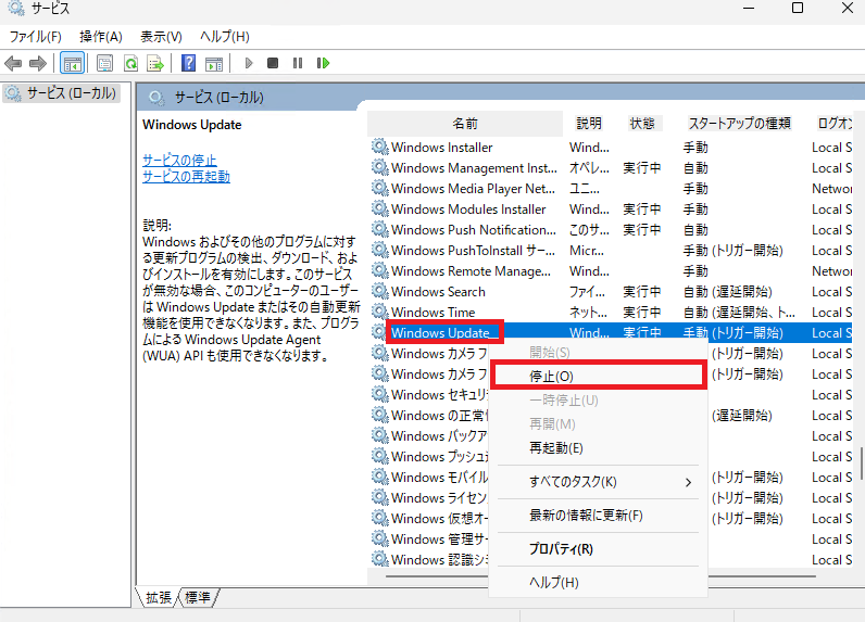 2.”Windows Update” サービスを右クリックし、[停止] をクリックします。