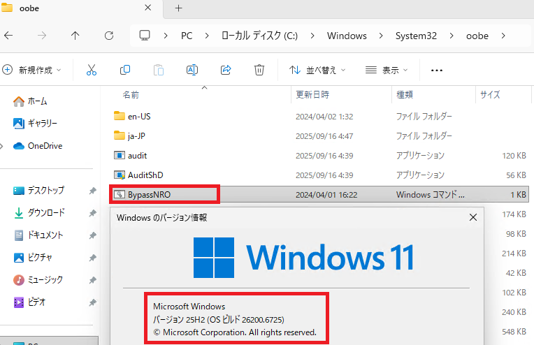 上述通り、BypassNRO は 25H2 の 26200.5516 より削除されると Microsoft 社は公表しましたが、私の環境では削除されませんでした…。