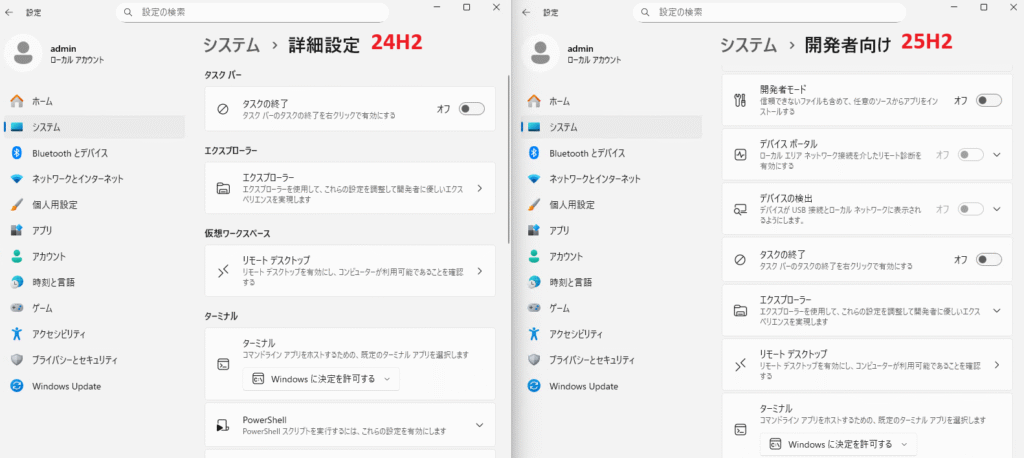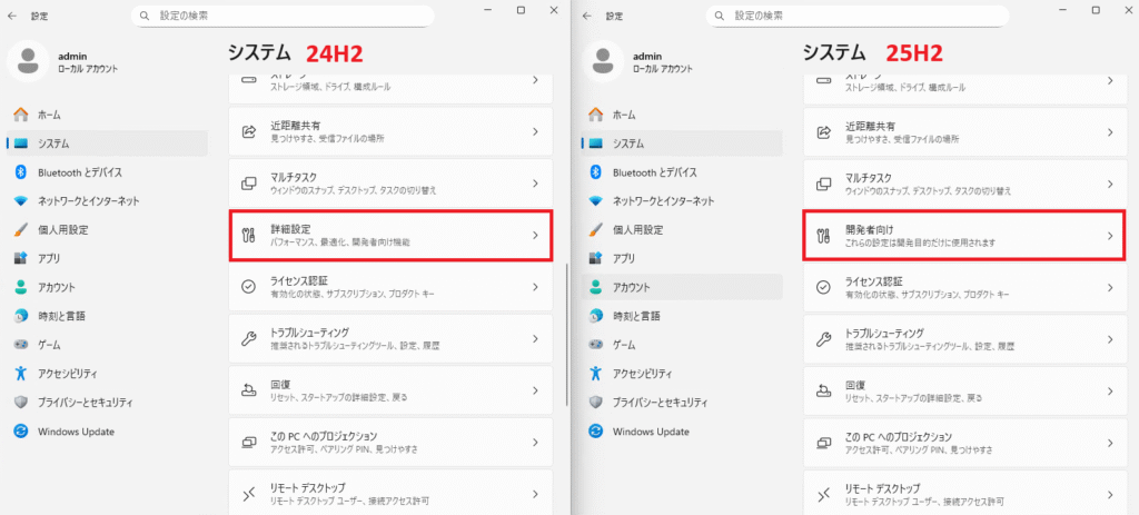 [システム] にて、24H2:[詳細設定] と 25H2:[開発者向け] で分かれています。