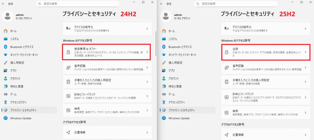 また [プライバシーとセキュリティ] の [Windows のアクセス許可] では 24H2 [推奨事項&オファー] が [全般] になっていました。