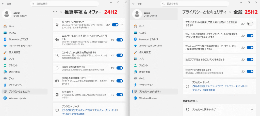 設定個所では 24H2 とは若干異なる UI を見つけたので、紹介します。