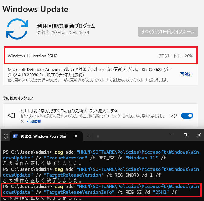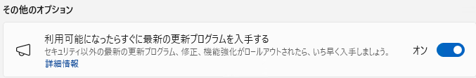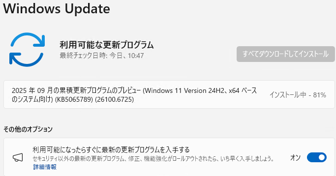 Windows Update から 25H2 をダウンロードする場合、上述通り、[利用可能になったらすぐに最新の更新プログラムを入手する] を ON にする必要があります。