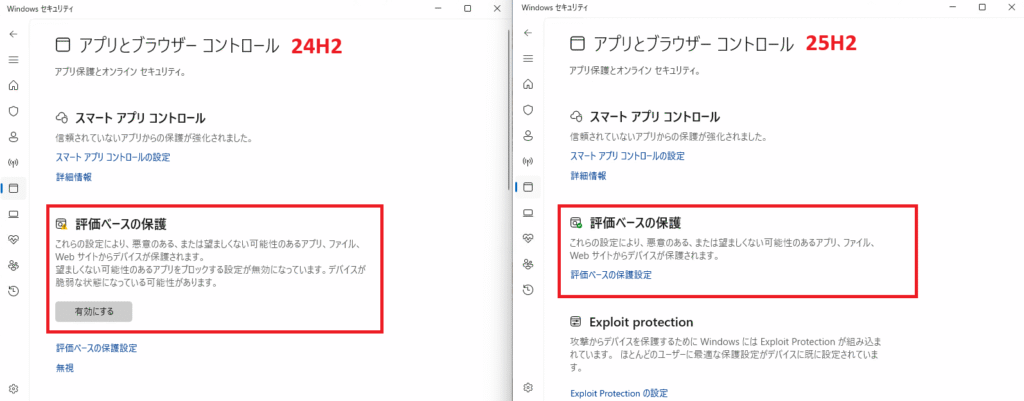 [アプリとブラウザー コントロール] ですが、[評価ベースの保護] が 25H2 では自動的に ON になっていました。