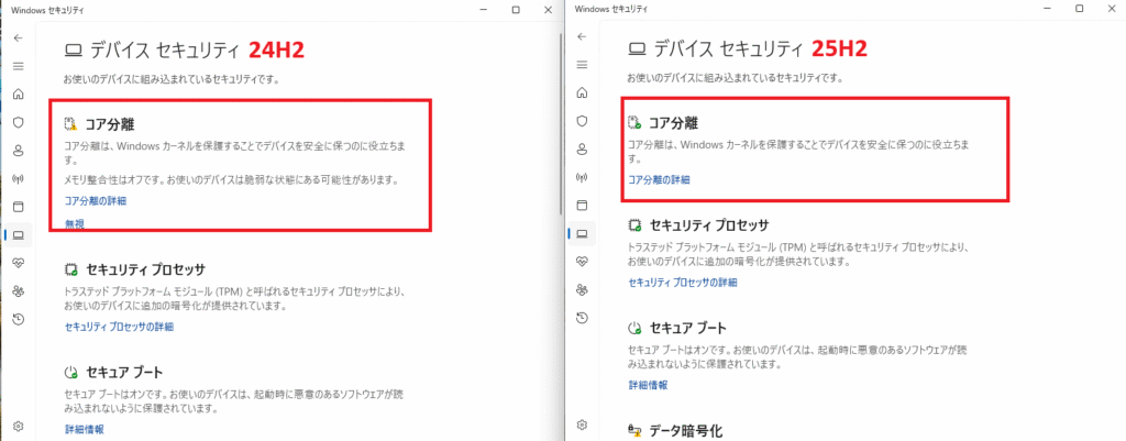 また、[デバイスセキュリティ] では [コア分離] も同様に 25H2 では自動的に有効化されていました。