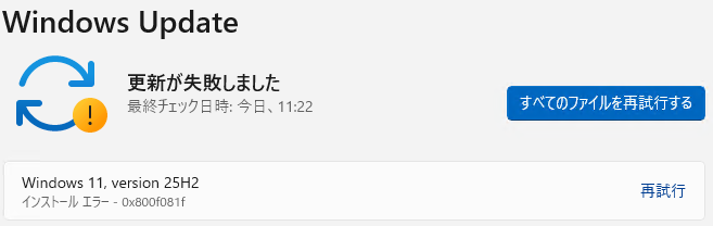 25H2 をダウンロードするとインストール完了 100% になるとエラー “0x800f081f” が表示されました。