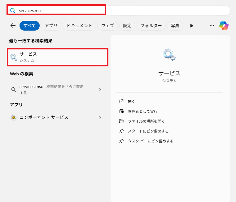 1.検索ウィンドウなどで、”services.msc” と入力し、[サービス] を起動します。