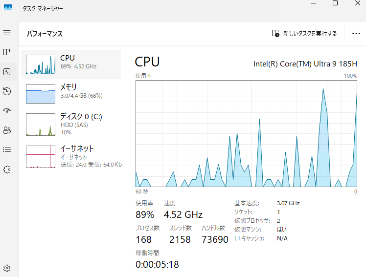 OneDrive で同期をしている最中、かつ2動画を再生すると、CPU 最大 90%、メモリ 3.0 GB でした。