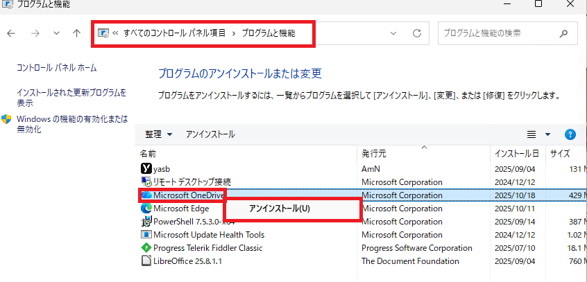 1.[コントロールパネル] – [プログラムと機能] から OneDrive をアンインストールします。
