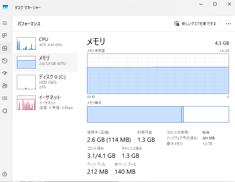 すると、CPU 使用時、最大80%、メモリ 2.6 GB まで低下していました。(もちろん OneDrive 以外の要因もあるだろうが…)