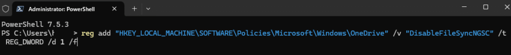 reg add "HKEY_LOCAL_MACHINE\SOFTWARE\Policies\Microsoft\Windows\OneDrive" /v "DisableFileSyncNGSC" /t REG_DWORD /d 1 /f